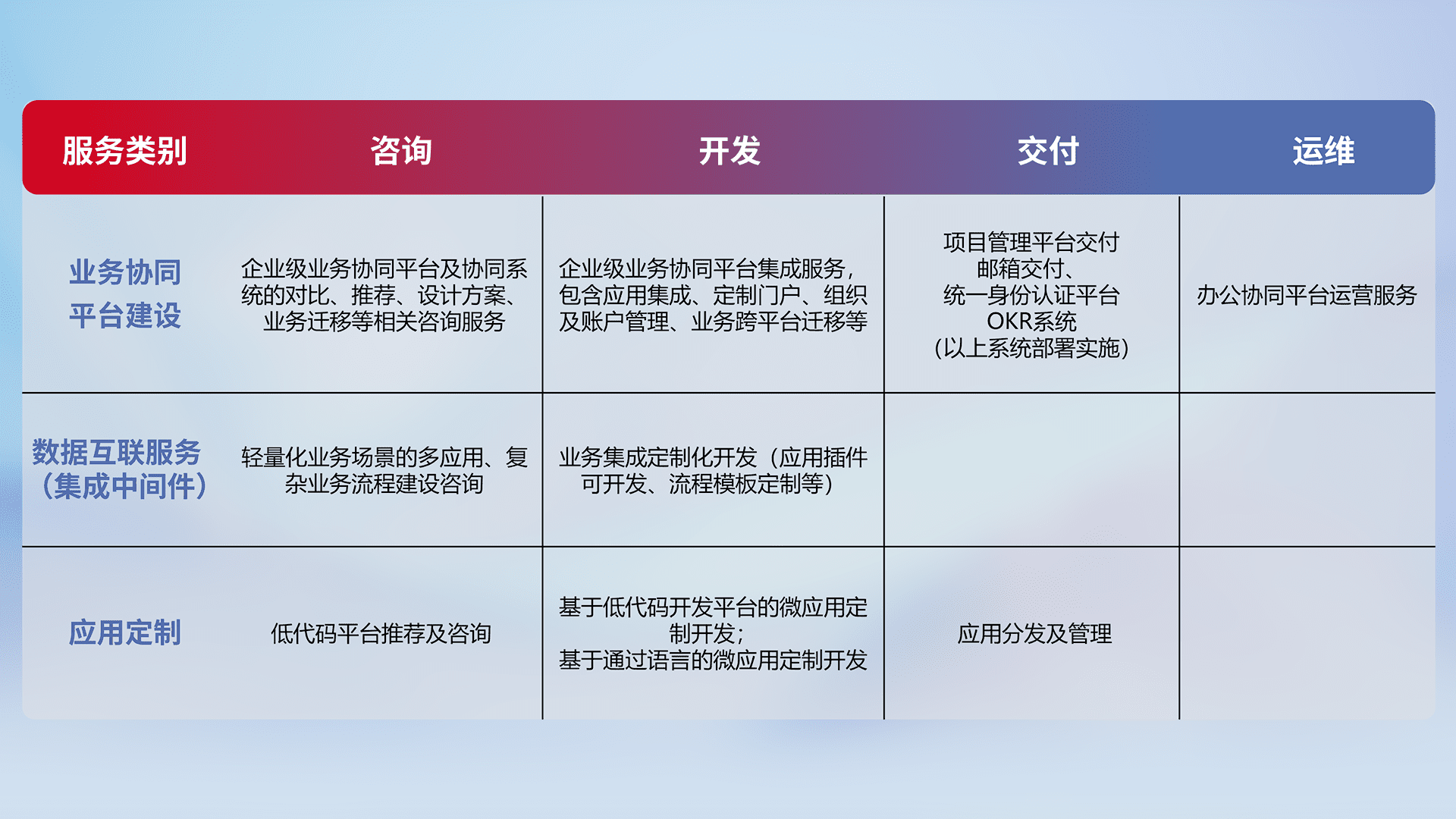 针对钉钉、、、企微、、、、IDaas等平台级产品提供产品的规划、、方案、、交付、、定制化开发等服务,,,实现如统一协同办公、、、、智能客户服务、、、混合会议管理、、智能数据查询、、、等业务场景,,实现数字化转型。。。。
